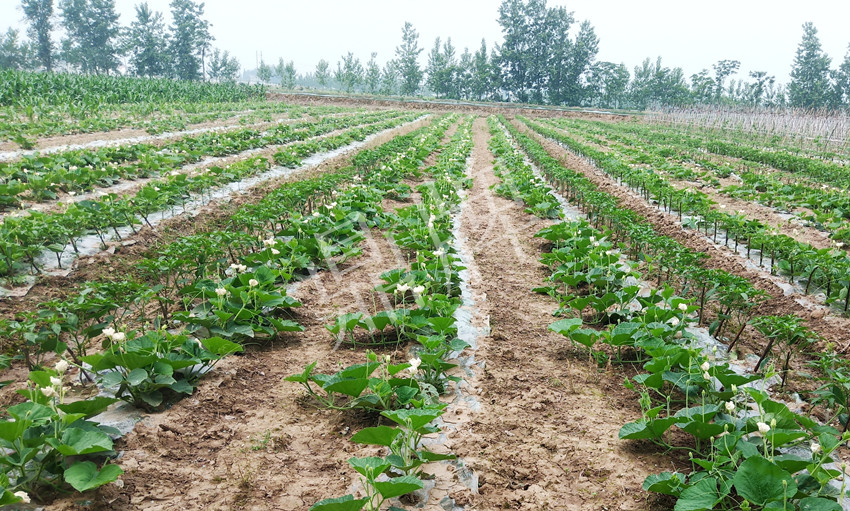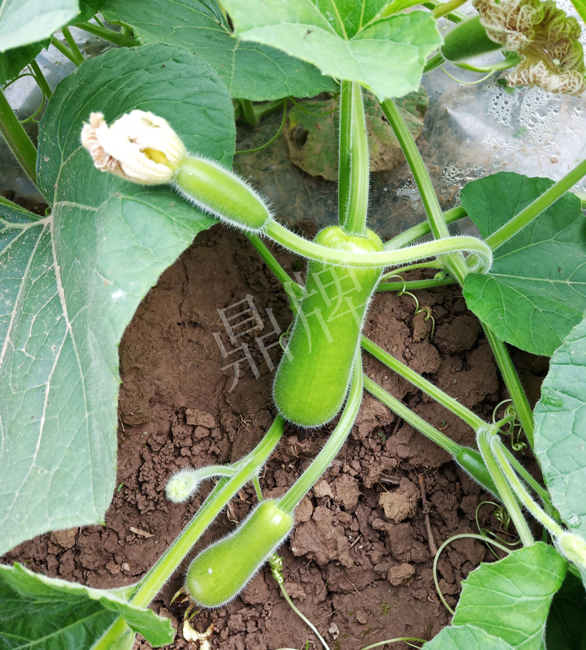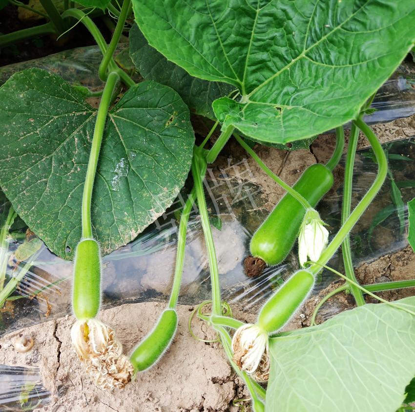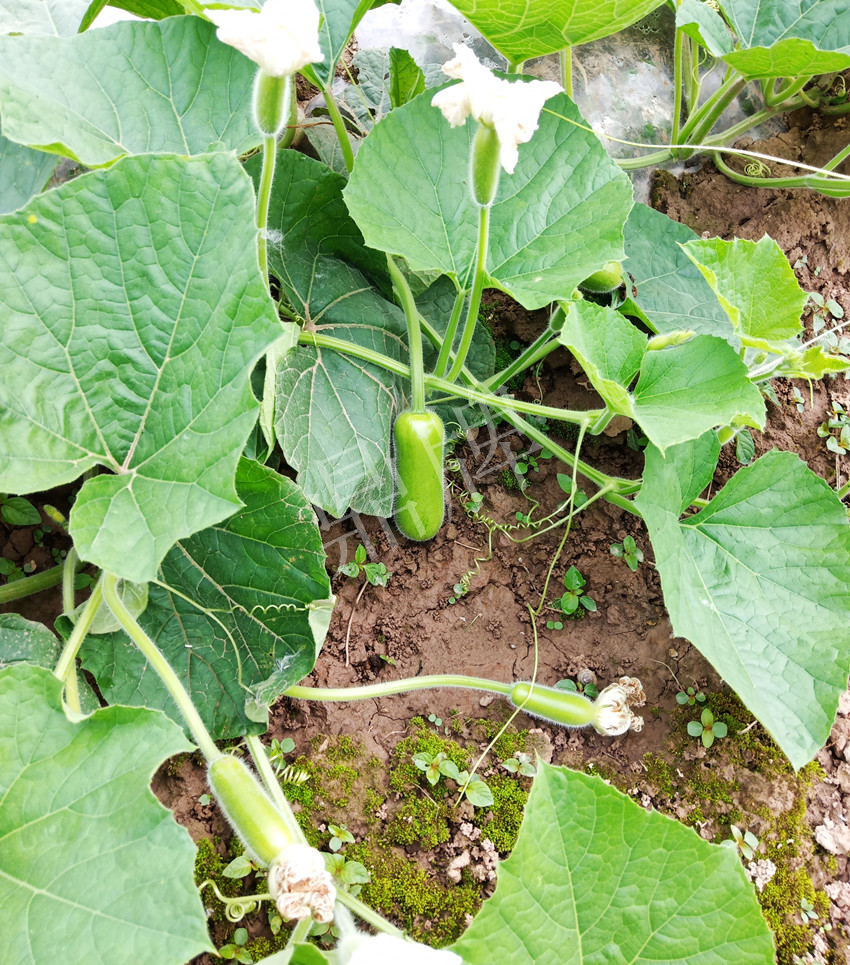 今年示范的新品種是“春棚如意”瓠瓜??炊ε铺峁┑馁Y料說明,是一個(gè)極早熟品種,前期坐果特別集中,這樣的品種正是我喜歡的,可以搶早賣上好價(jià)錢。因大棚安排滿了(大棚內(nèi)主要安排的是鼎牌絲瓜“優(yōu)比1號”、鼎牌甜瓜“玉奶香2號”、鼎牌南瓜“小胖墩”),所以,我在大棚只種了5分地的“春棚如意”瓠瓜,在露地種了1畝5分地,為了減少成本和勞動力,我在露地采用爬地栽培。